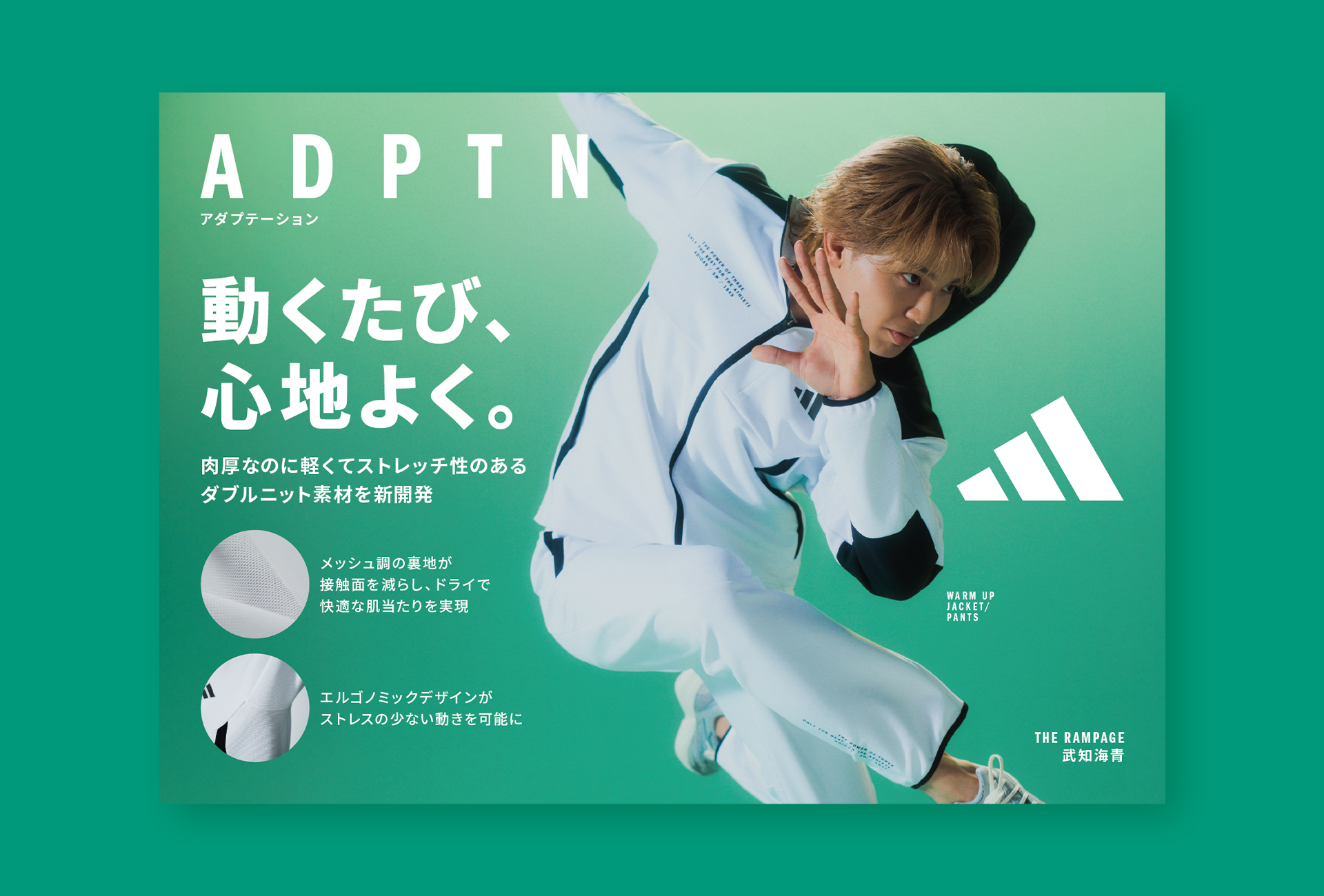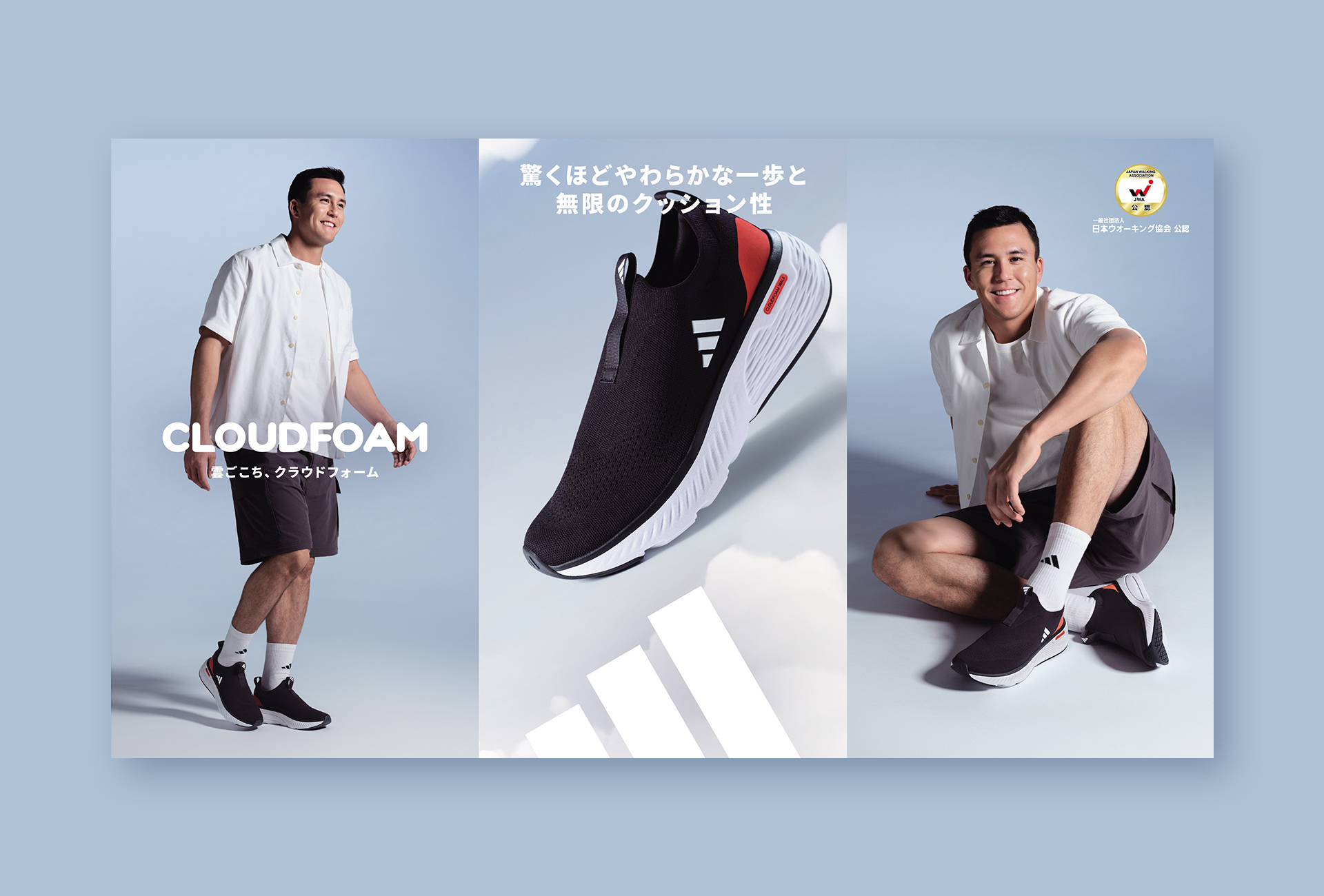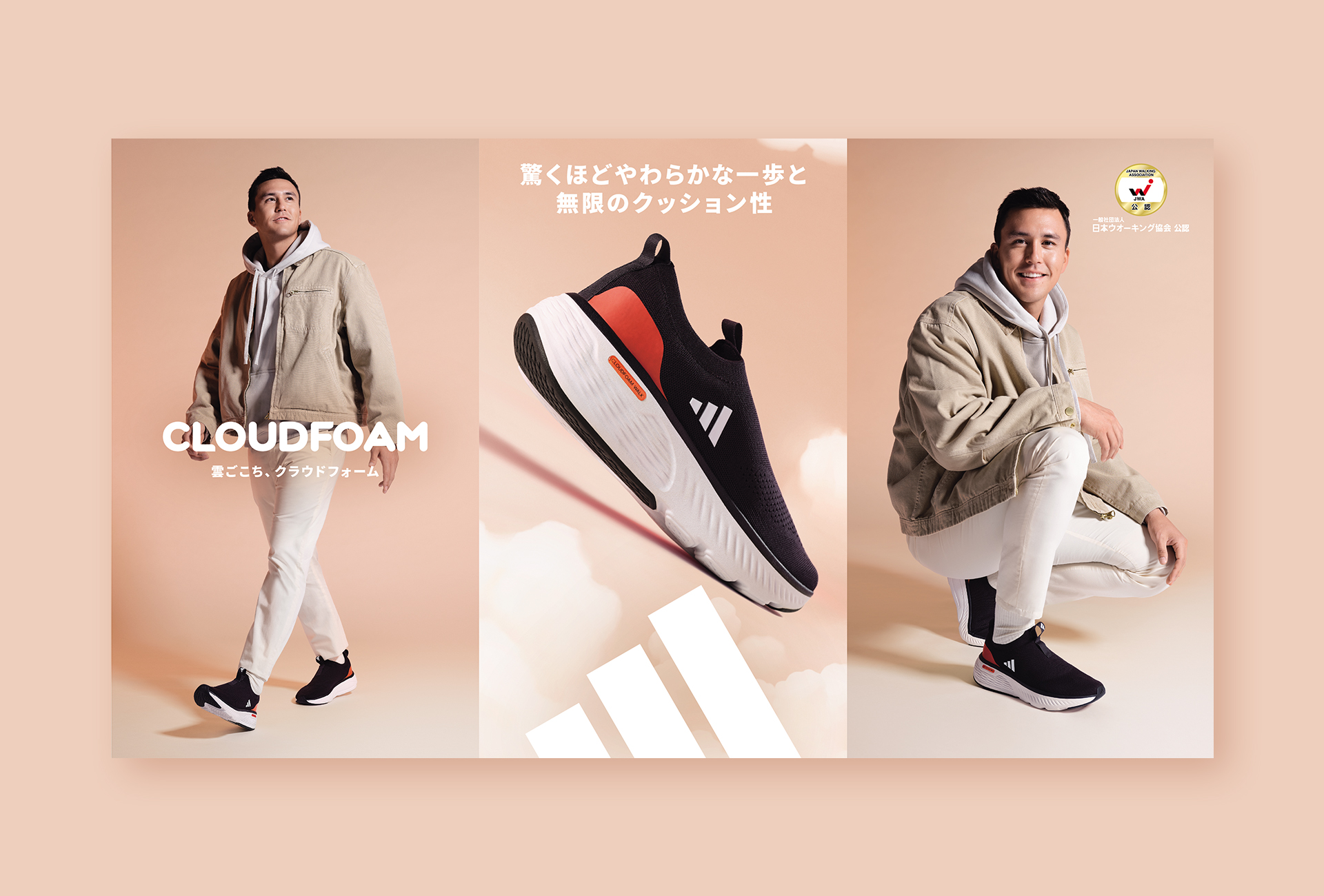 アディダスの多彩なプロダクトと、著名アスリートやタレントを掛け合わせたプロモーション企画。ウォームアップウェアではTHE RAMPAGEの武知海青さんを、ウォーキングシューズではヌートバー選手を、高機能トラックスーツでは元サッカー日本代表の槙野智章さんを主役に起用。出演者の個性やダイナミックな動きを通して、製品が持つ機能性や心地よさを直感的に伝えるクリエイティブを開発。 商品の機能特性を“生活者が実感できる価値”へと翻訳し、より身近に、かつ魅力的に体感できるビジュアルを制作。商品理解の深化と購買意欲の喚起を両立させ、機能訴求を生活者の心に届く体験へと昇華し、強いインパクトとブランドへの共感を獲得するプロモーションをデザインしました。