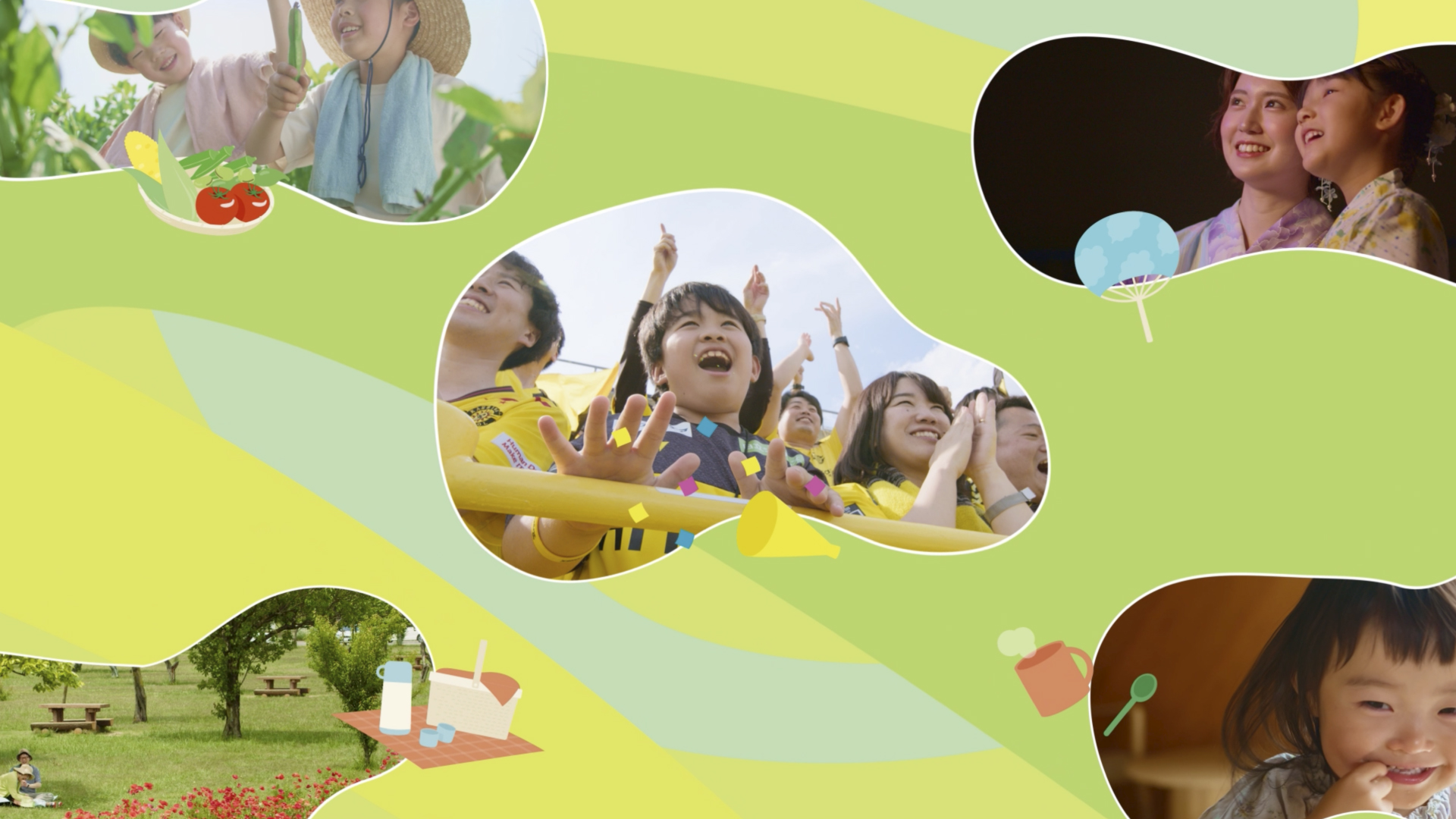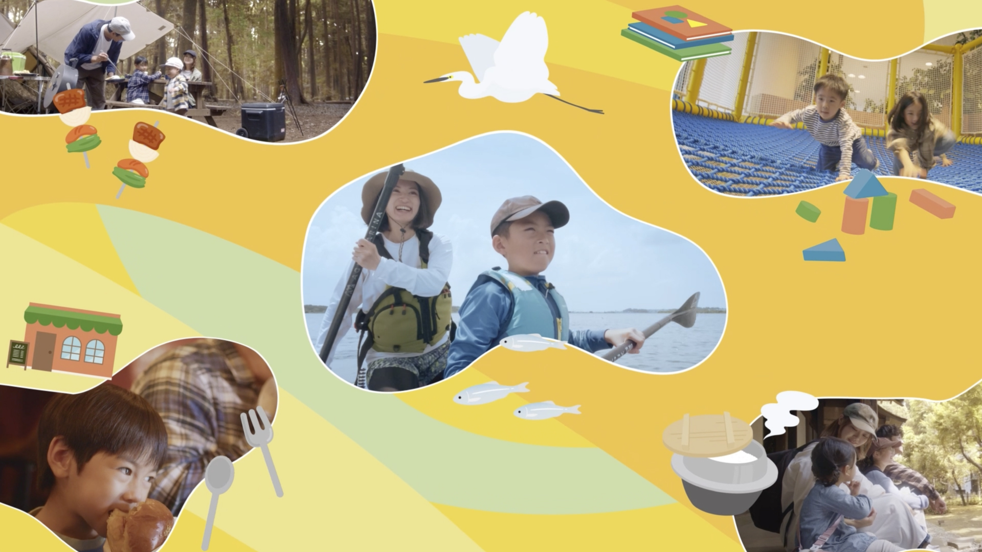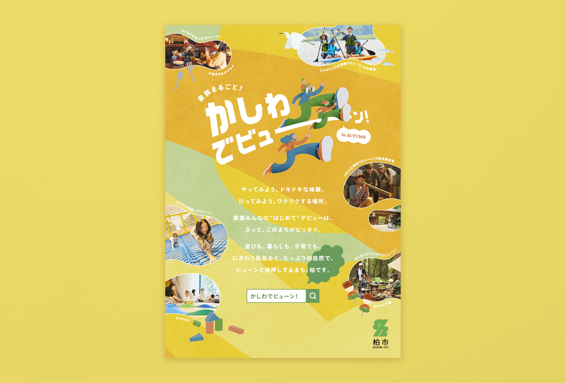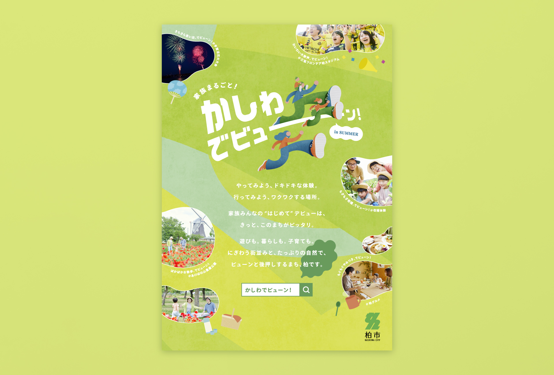柏市が持つ魅力をより多くの人が受け取れるよう、そして、柏市への想起の旗印をつくるために、「家族まるごと!かしわでビューン!」というキャッチコピーを傘に各種広告物を制作。オノマトペを用いながら体験のリアルな感触を描いた動画や、イラストと実写を組み合わせ、体験へのイメージをリッチに描き出すグラフィックを制作し、限られた広告露出のなかで柏市の様々な体験を紹介するにあたり、生活者からの直感的な理解を促すことを狙った。
