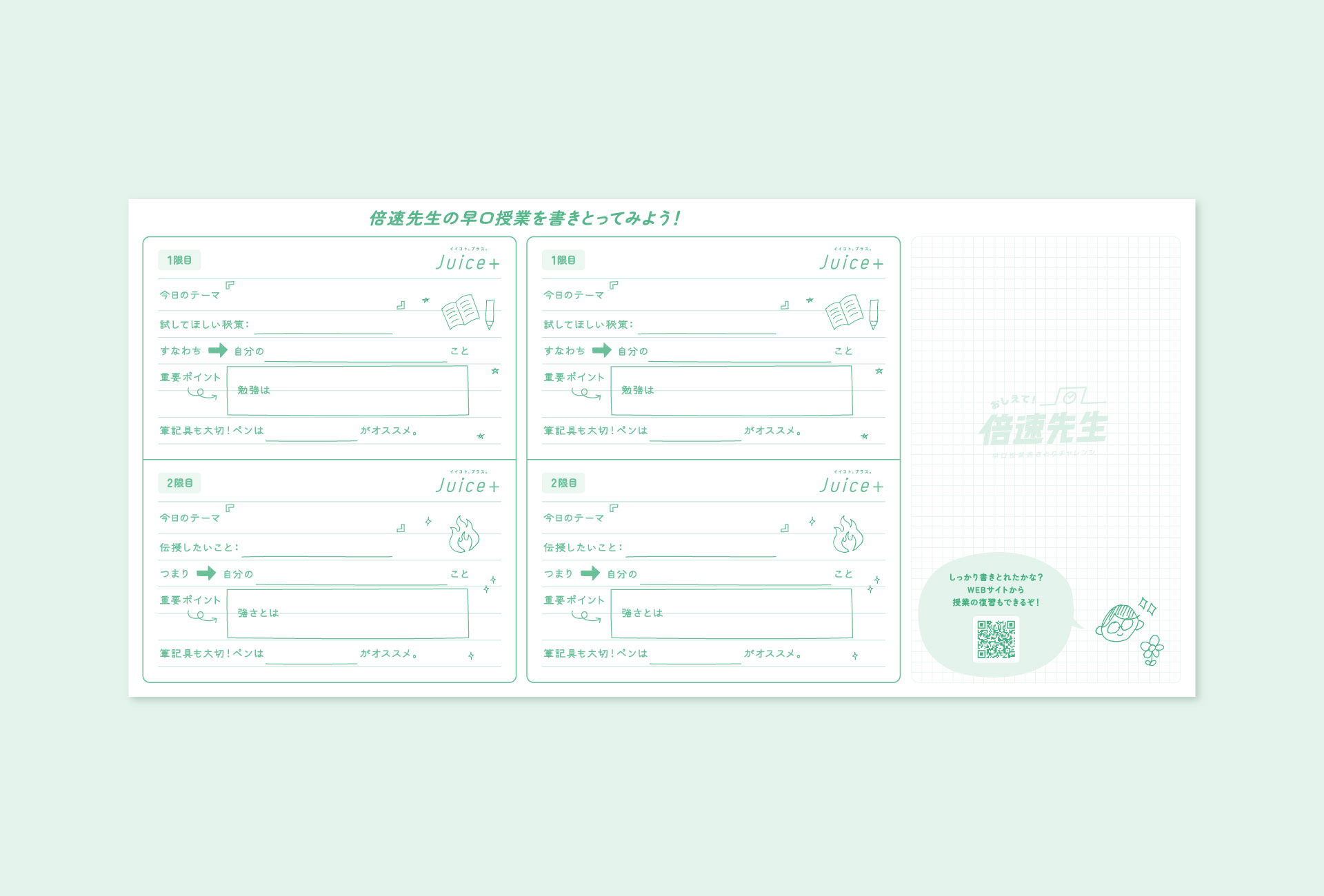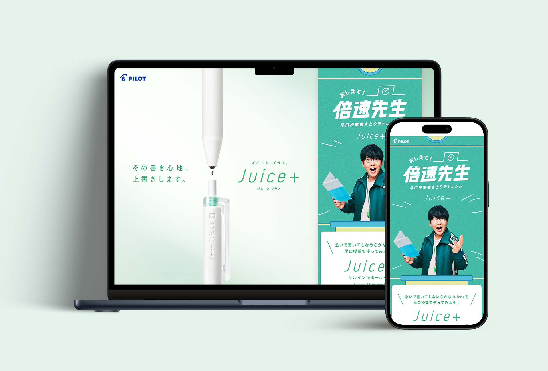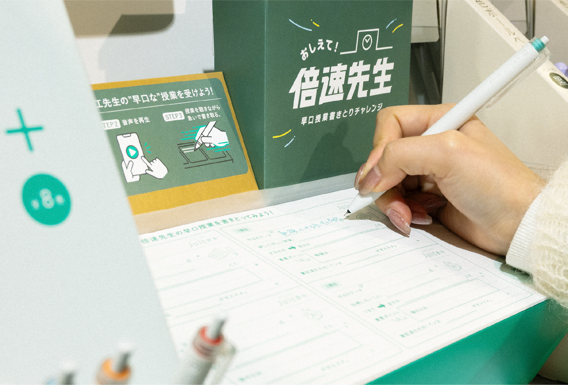 単なる情報の押し付けではなく、思わず商品を手に取りたくなる「意欲」をデザインすることを企画の狙いに設定。ターゲットからの高い人気を誇る声優の花江夏樹さんを起用し、音声企画「教えて!倍速先生」を展開。 店頭経由で配信される音声として、学生の糧になる教えを早口で語りかける「超早口授業」を制作。さらに、店頭の試筆紙を授業を書きとる「専用ノート」へ作り変えた。花江さんの授業を「書き取らなければならない」という必然性を作り、商品のなめらかな書き心地を自然と試せるよう誘導。PILOT公式SNSでの段階的な情報解禁から店頭への送客まで、デジタルとリアルを一本の線で繋げた商品体験を創出した。